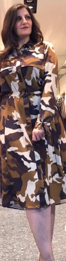 Spread collar with spacing between collar ends. Floating from top to bottom with no fullness gather controlling the structure in the waist. Tailored with camouflage prints mixed with for a day in the park. Made with long full arms held at the wrist with a cuff. Summer Plus size dress casual 2020 fashion.